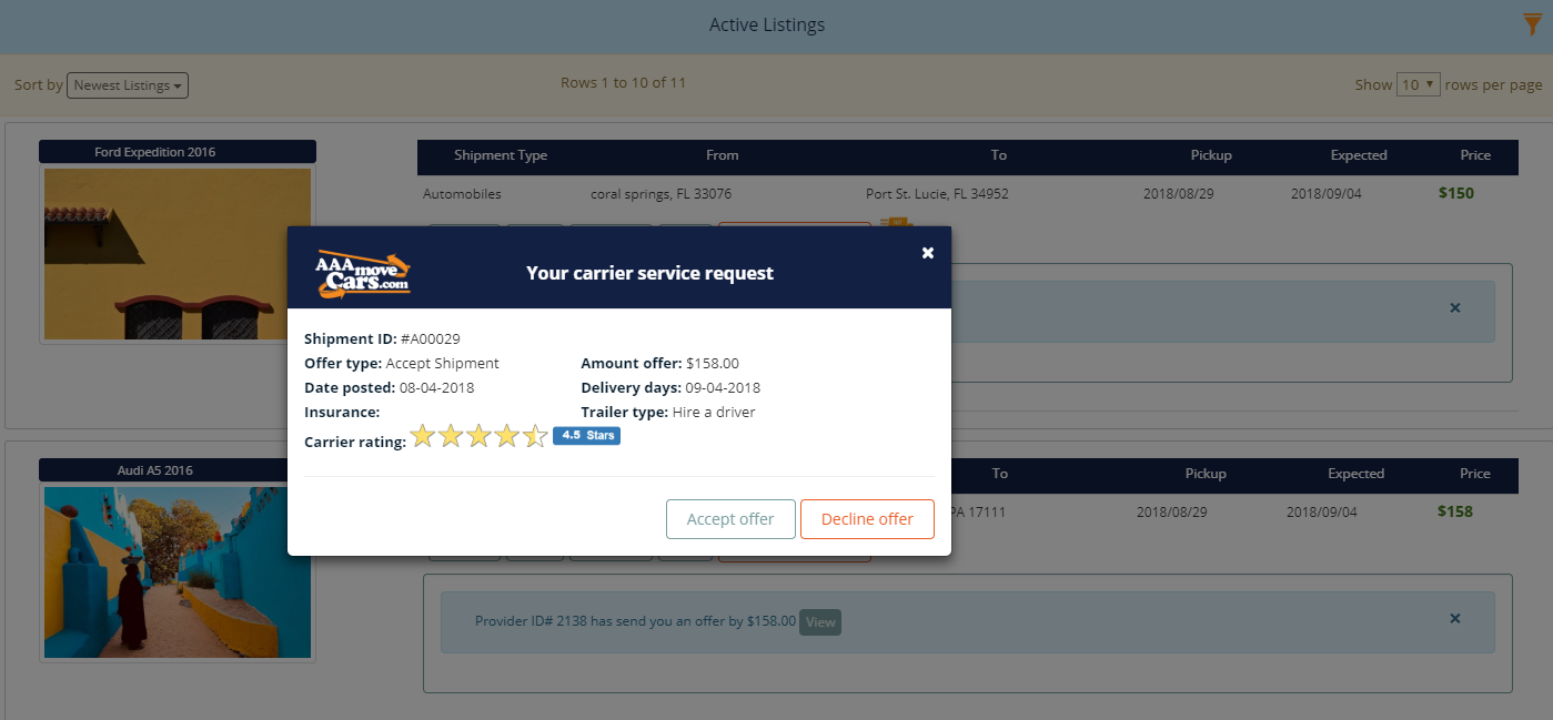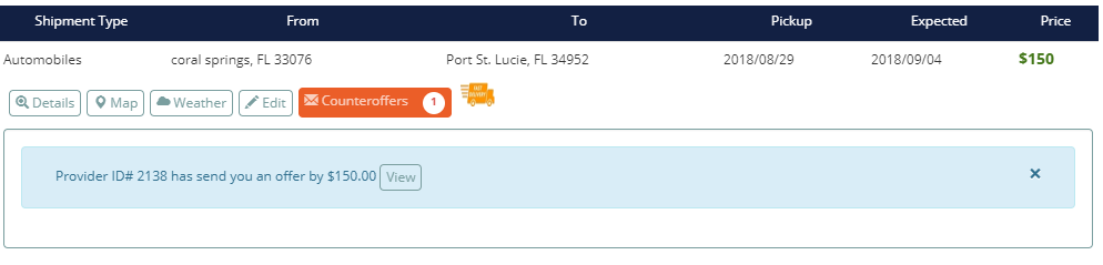 Once a carrier shows interest in your shipment, a red button will appear in your dashboard under Active listing. The counteroffer button will show all your carrier transport requests.
